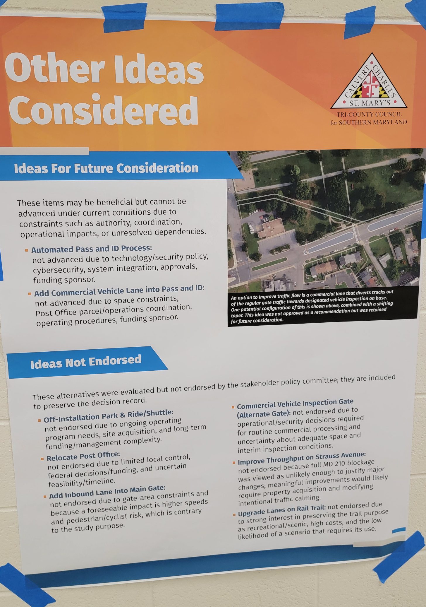 Our view: Any recommended concept should clearly show peak-hour impacts for both installation traffic and local residents, projected further out (analysis all the way toward MD 225, far beyond the current study’s limited scope). That includes north-side and south-side turning access, not just what happens at the gate.